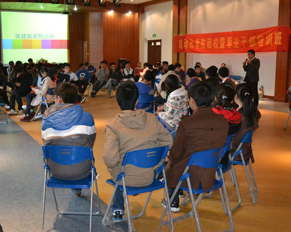 活动分为三个环节。首先是有趣的“大风吹”活动,紧张而又刺激,会场气氛顿时轻松了很多,学员之间也增添了不少熟悉感。在主持人的统一安排下,全体学员有序分为九组,进行“同舟共济—踩报纸”活动,各组成员积极讨论,出谋划策怎样站立才能使站在报纸上的人更多。特别是第九组,为了增添站立人数,男生甚至把女生背了起来。最为精彩的是室外“冒险”活动,分为三大组进行。在行进过程中,被蒙起眼睛的组员要依赖组长的带领去完成“冒险”任务,使得不少学员大叹合作和信任的重要性。在组长机智英明的带领下,第三组全体组员相互信任,团结一致,用最短时间完成了任务。总结交流时间,学员们即兴表演的一段江南style的舞蹈,使现场气氛异常热烈活跃。最后,张建波老师对此次活动进行总结点评,他强调团队合作对学生工作的重要性,使学员们受益匪浅。