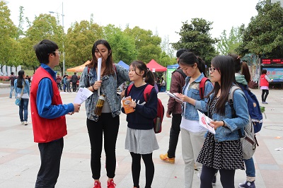 从上午10点起,爱心社的社员们就在南二南三广场积极的向过往的同学们介绍本次的“义工体验月”活动,向他们介绍此次为同学们开放的各大义工点:华澳听力语言恢复中心,明心儿童益智康复中心,栖霞老人院,平安阿福流浪猫狗收容中心,仙鹤门社区辅导班。当许多有着公益梦的同学向社员们询问自己关心的义工点,社员们也都热情详细的为他们解答疑惑,尽管天气不好,甚至下雨,但都浇不灭他们心中火热的爱心公益之情。在社员们的感染之下,一批又一批的同学成了本次义工队伍中的一员,大家都怀着一颗真挚有爱的心,希望能出到自己的一份力,现场弥漫着感动而又温馨的氛围。