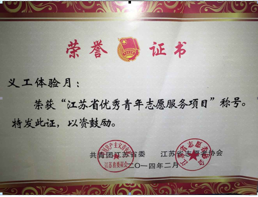 由于在志愿服务工作上的突出表现,今年上半年英国best365官网团委还荣获“江苏省青年志愿服务行动组织奖”,爱心社品牌活动“义工体验月”荣获“江苏省优秀青年志愿服务项目”称号。