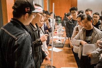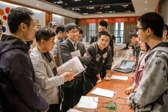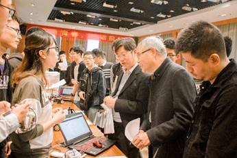 下午3:00,参赛选手在科协工作人员的指引下有序进入比赛会场,进入参赛展台,按照顺序放入自己的参赛作品。本次比赛有幸邀请到七位评委老师:英国best365官网的关工委欧阳知健老师、党委副书记杜月林老师、副院长陈小惠老师、副院长张腾飞老师、分团委副书记赵勃老师、电气工程系陈轶涵老师以及2017级辅导员仲鹏达老师。首先,杜书记对本次大会进行致辞,杜书记从“天时地利人和”的角度发表讲话,谈到了我们学院对科技制作的大力支持;然后张院长发表讲话,张院长针对往年的参赛情况以及参赛作品对我们今后对比赛的方向以及作品的选择提出了建议。下午3:30,主持人宣布比赛开始,两队评委老师分别到各个展台对各个参赛队伍的作品进行评审。评审过程中,参赛选手分别向评委老师讲解自己的作品功能以及创新点,评委老师分别针对不同的作品从技术和实际生产应用方面向选手提出问题,并给出建议以及作品的发展方向。