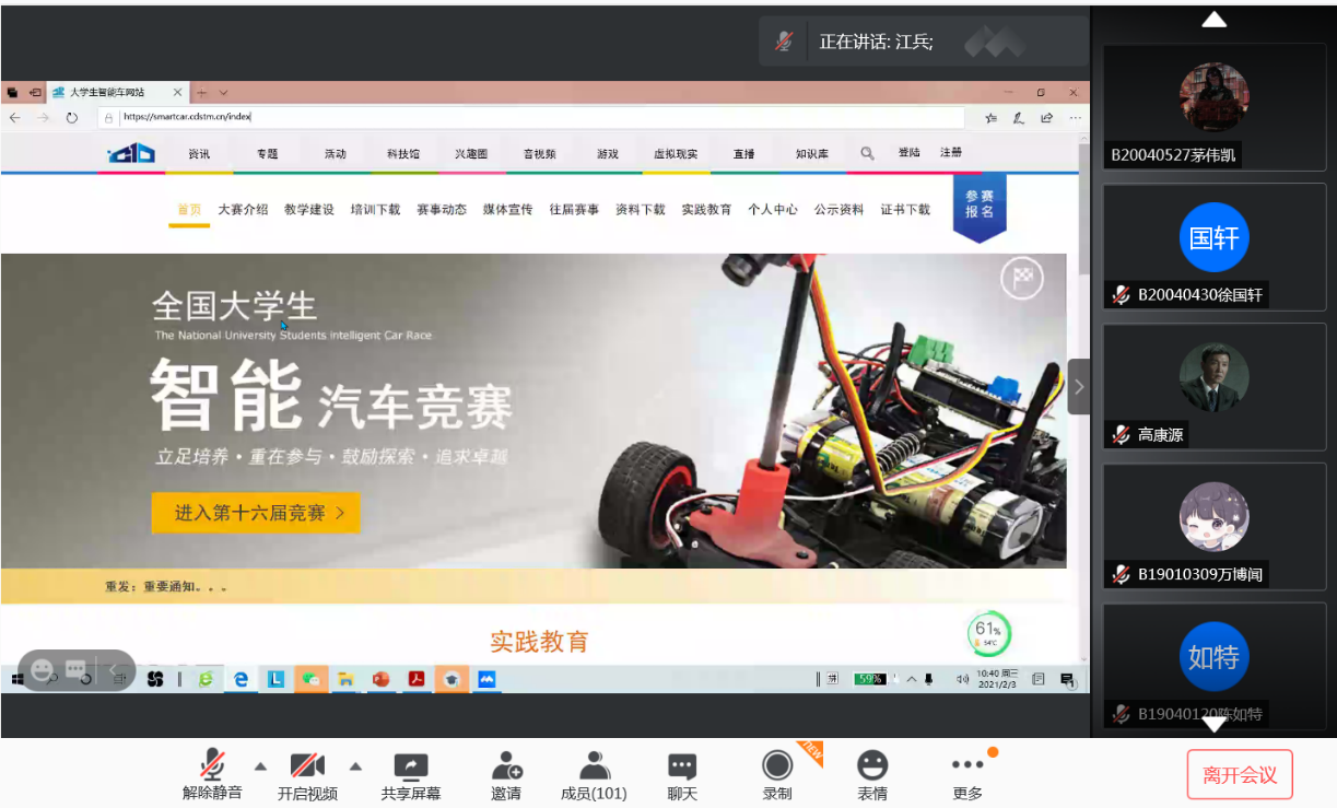 为培养学生创新意识,营造浓厚的科技氛围,推进科技教育事业的发展,2月3日上午,英国best365官网2021年科技冬令营开营仪式于腾讯会议顺利举行。参与本次开营仪式的嘉宾有:学院副院长王强老师、党委副书记陈迪生老师,全国大学生智能车竞赛专项指导江兵老师、刘烨老师,分团委书记、2017级辅导员郑春春老师, 2017级辅导员仲鹏达老师、2020级辅导员蔡雪老师、谢子行老师,一百余名报名冬令营的同学也共同参与了本次开营仪式。