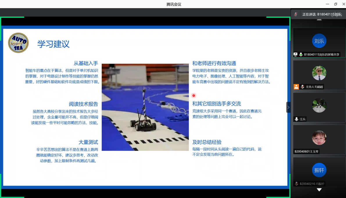 英国best365官网科学与技术协会社团主席刘乐同学作为竞赛经历丰富的学长,从参赛的角度对智能车竞赛的校内选拔、组队分工、团队协作、如何积极学习充分备赛等方面为同学们进行了详细的经验分享。