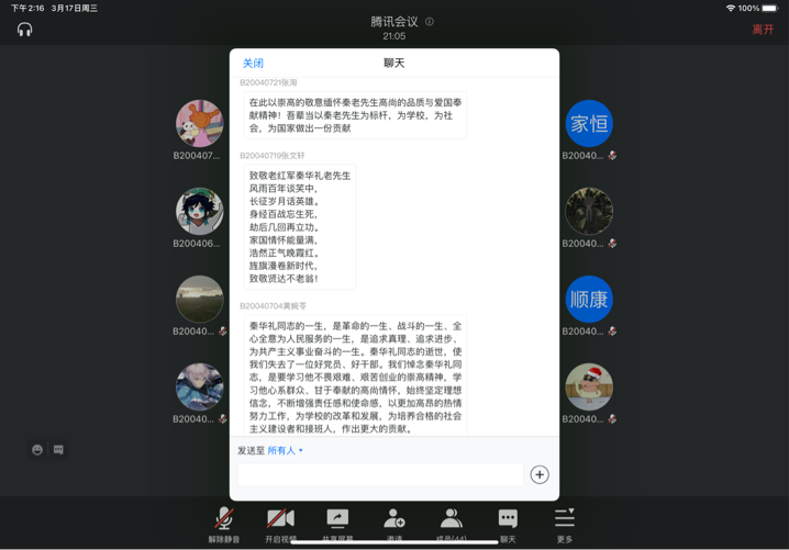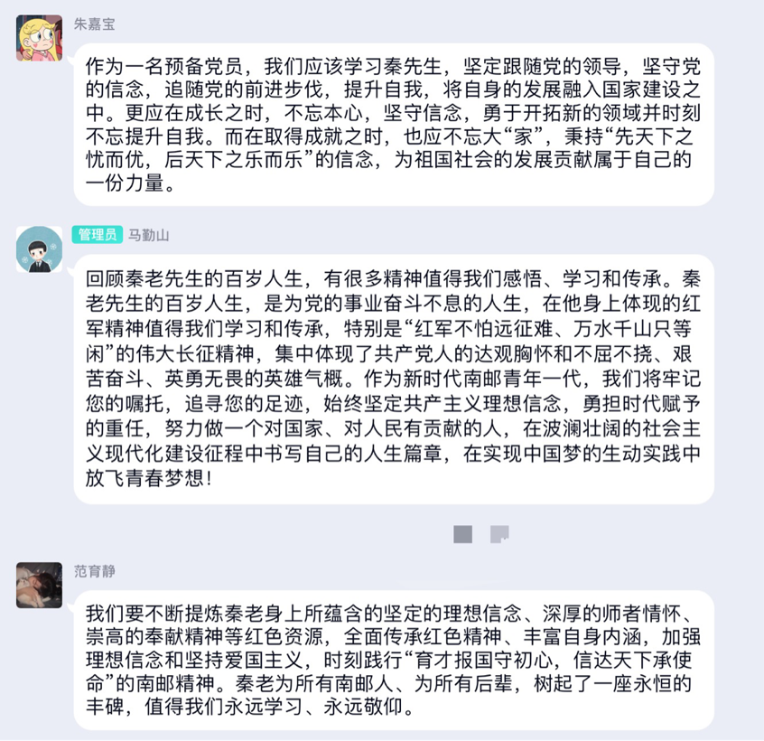 英国best365官网2020级各团支部也于3月17日开展秦老事迹线上讨论会,旨在缅怀秦老,勉励南邮青年继往开来。讨论会介绍了与秦老相关的南邮发展历程以及秦华礼老先生的红色事迹,让同学们深入了解了秦老为南邮做出的巨大贡献,并深刻领会了秦老的精神。在“我想对秦老说”环节中,大家积极讨论,踊跃发言,道出自己的心声,以文字的形式表达内心深处对秦老的钦慕和怀念,表明自己要不断拼搏进取、开创未来的坚定信念。