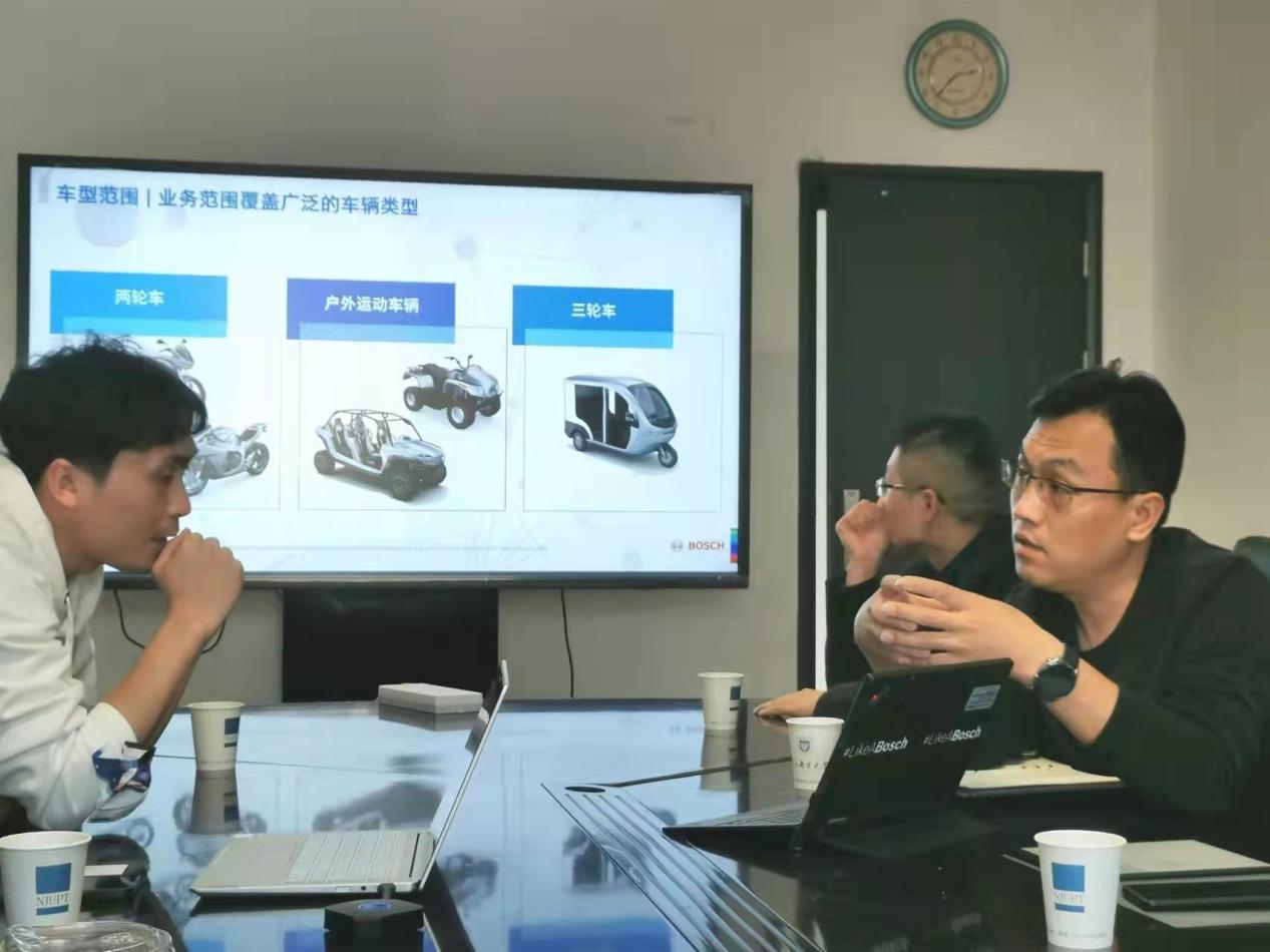 郭鸿浩老师、刘泽远老师、刘烨老师与博世公司技术负责人进行深入交流,通过分析市场现状、现有成果等方面,就产品的电机驱动、电拖控制、智能互联等方面的合作展开讨论,初步明确校企合作研究方向。