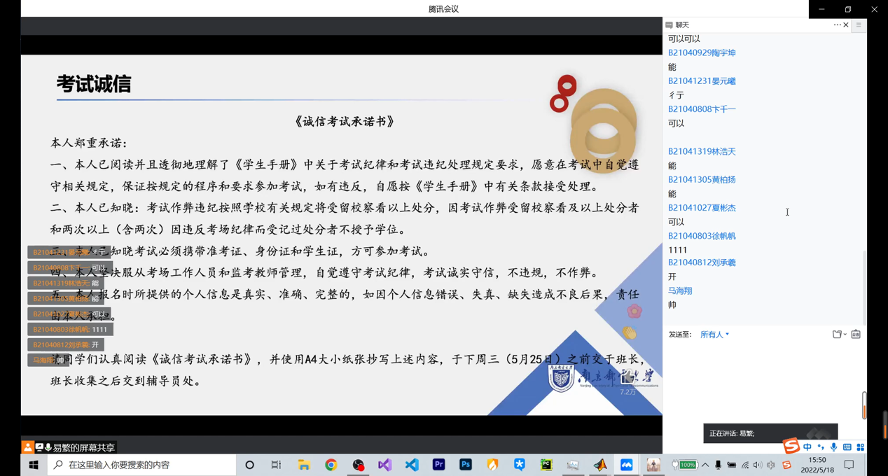 5月18日,英国best365官方网站入口、人工智能学院2021级采用线上班会方式,召开诚信教育大会,严格落实考风考纪教育和诚信教育要求。2021级辅导员郑春春、谢子行、范艺分别进行主持,为2021级同学们带来一堂精彩的诚信教育课程。